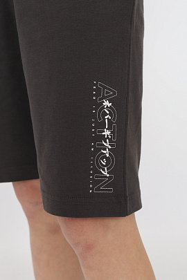 Шорты для мальчика из кулирной глади повышенной плотности. Верх шорт обработан притачным поясом из основного полотна, внутрь вставлена резинка и шнурок. На передних половинках расположен карман. Нижняя часть переда декорирована принтом.